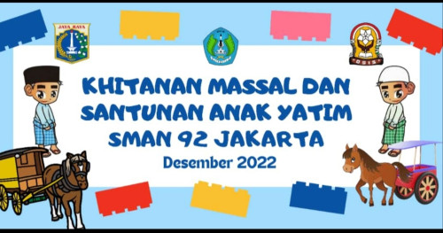 Sabtu, 17-12-2022.. SMAN 92 Jakarta mengadakan Sunatan Massal dan Santunan Anak Yatim.. Berkolaborasi dengan Tim Dr. RS Sulianti Suroso, Tim Delman Islamic Centre, OSIS-MPK, Rohis, Drumband, Hadrah, PMR, Cinematography dan berbagai unsur lain.. Akhirnya, agenda ini yg sudah 2,5 tahun tak terlaksana akibat pandemi bisa diselenggarakan.. Diketuai oleh Bpk Ferry Ilhamdi Alhamdulillah terlaksana.. SMAN 92 Jakarta membuktikan bahwa kehadirannya mampu memberikan manfaat bagi warga sekitar.. Semoga ikhtiar ini mampu menjadi Amalan terbaik bagi siapapun yg telah berkontribusi didalamnya.. Acara diawali dengan Arakan Andong Keliling Kampung-Santunan Anak Yatim- Proses Khitan..