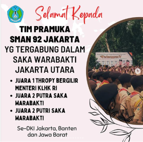 Alhamdulillah Tim Pramuka SMAN 92 Jakarta yang tergabung dalam Sakawanabakti JU berhasil memperoleh prestasi Juara 1 Menteri KLHK RI dan Juara 2 Katagori Putra Dan Juara 2 Katagori Putri Sakawanabakti.. Terus Semangat Anak Anak Muda.. Kalian Membanggakan.. Salam Pramuka...